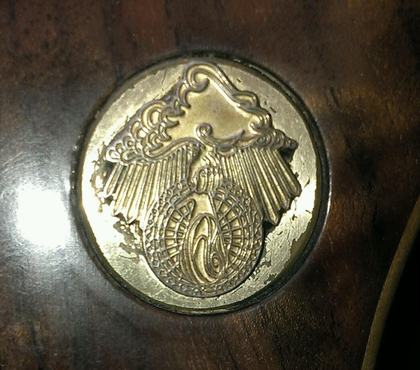 If it were me, I'd move the medal, and restore the rotary switch and the brass plate down there on the horn.  I wouldn't go back with restoring the broken tips of the Omega:  Let them sand/carve the cutout as it is and refinish.  Those tips on my Spoiler scare the hell out of me every time I pick it up and set it down !