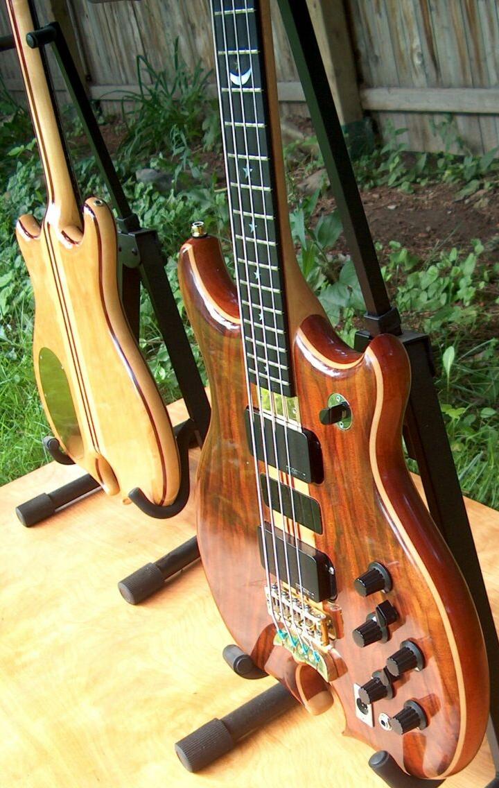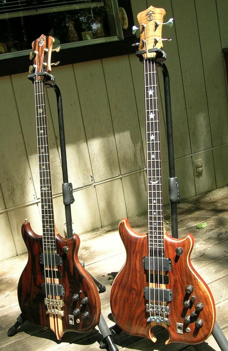 It ain't superb walnut, but it is beautiful, none-the-less.  I really love that bass.  Hmmm, I really love both of them.  What if I could only have one?  I guess I'd just have to find a two-bass nursing home, I suppose, because as long as I have a buck in my pocket, I ain't selling this pair.  There is just something great about the large, standard bodies.  The Alembic icon.  The walnut one is already spoken for, come the time they need to move on.