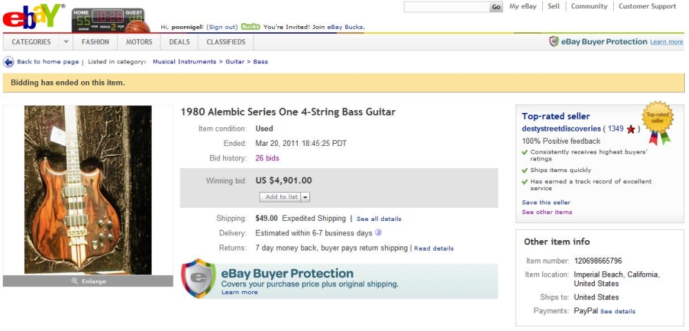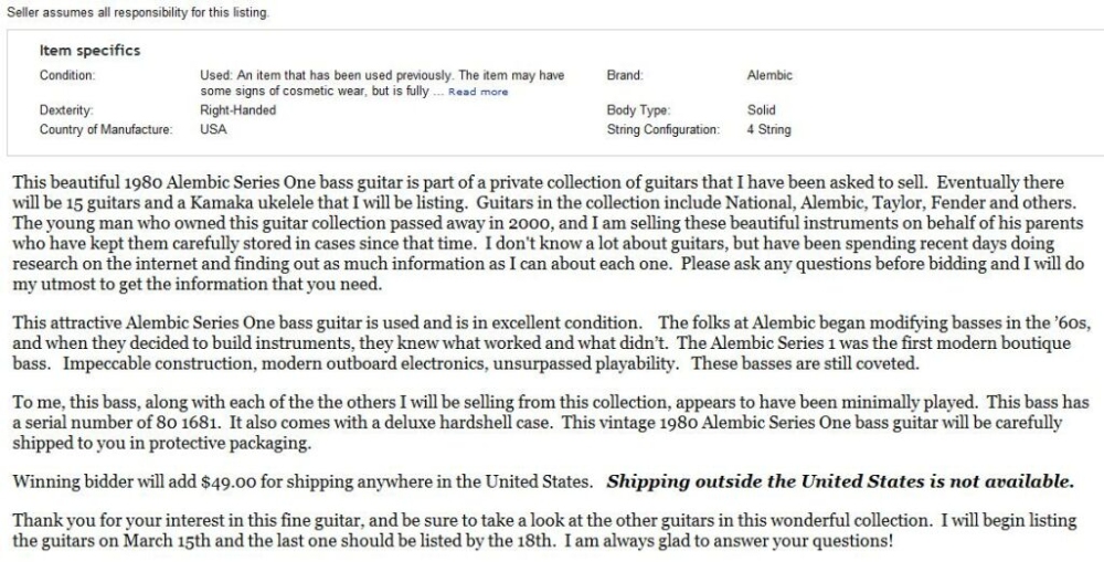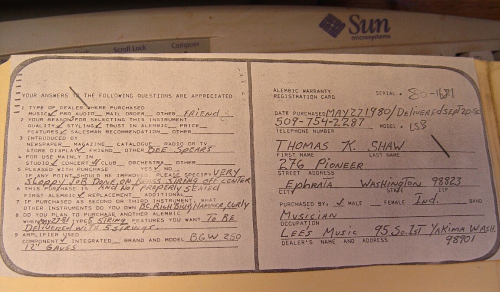 I was taken for quite a ride on this bass' auction, so no thanks.  Though I do have a fondness for four-stringed instruments, no singing IZ songs for me this summer.  Here is something cool Mica sent me.  Note - I did not fill this out.  Must have been my friend who owned the store or one of the employees there.  I am posting it, as it is part of this bass' official record at the factory, so cool it is!  I just looked Ephrata, WA up in the Wiki article of it.  Interesting place, or not.  Never even heard of it before tonight.  I have never had a hankering for Hammers, Riches, or Curly basses, though I did used to use BGW amps and Gauss speakers, but not 12's back then.  I bet it was this lead player that played in a metal band that used to gig in Vegas and Reno all the time.  We loved messing with each other back then.  I must have left this card setting on the counter out of distraction from the amazing instrument that was in the case that with it.  Anyway, the crack about wanting the next one to be sent with five strings was aimed at Susan, as this was supposed to come a five string, but the fifth string got lost in the five months it took to build and ship it, and it arrived as a four.  Alembic being a company of solid integrity, Susan comped me a preamp (easily covering a fifth string, IMO), so I would not have put in a dig like that.  All in all, I like this piece of history, whoever filled the card out.  With shipping, I paid about $100 or $200 less for it in the auction than it retailed for in 1980, but who paid retail, even back then, eh?  I have missed this bass I did not want to get rid of, so am just glad to have it coming back my way.  This showcase is for the next owner to read somewhere down the road, when my turn is up, again.  Whoever you are, enjoy!  You've got a dandy bass there Mister, or Sister.