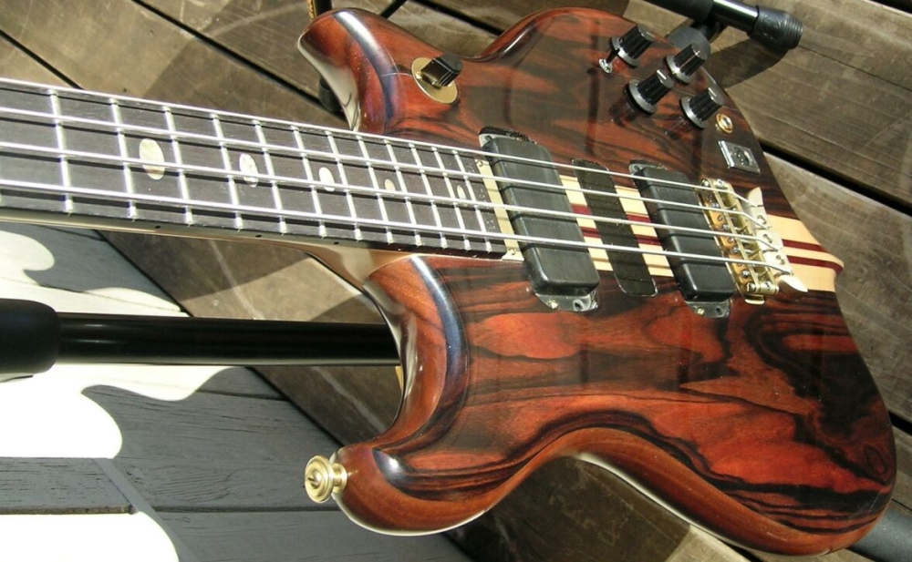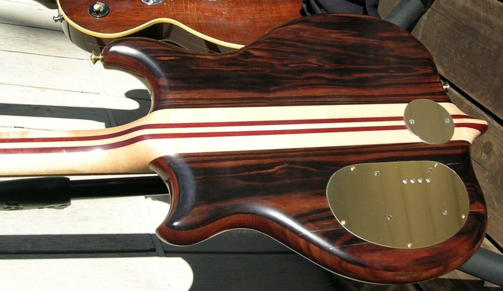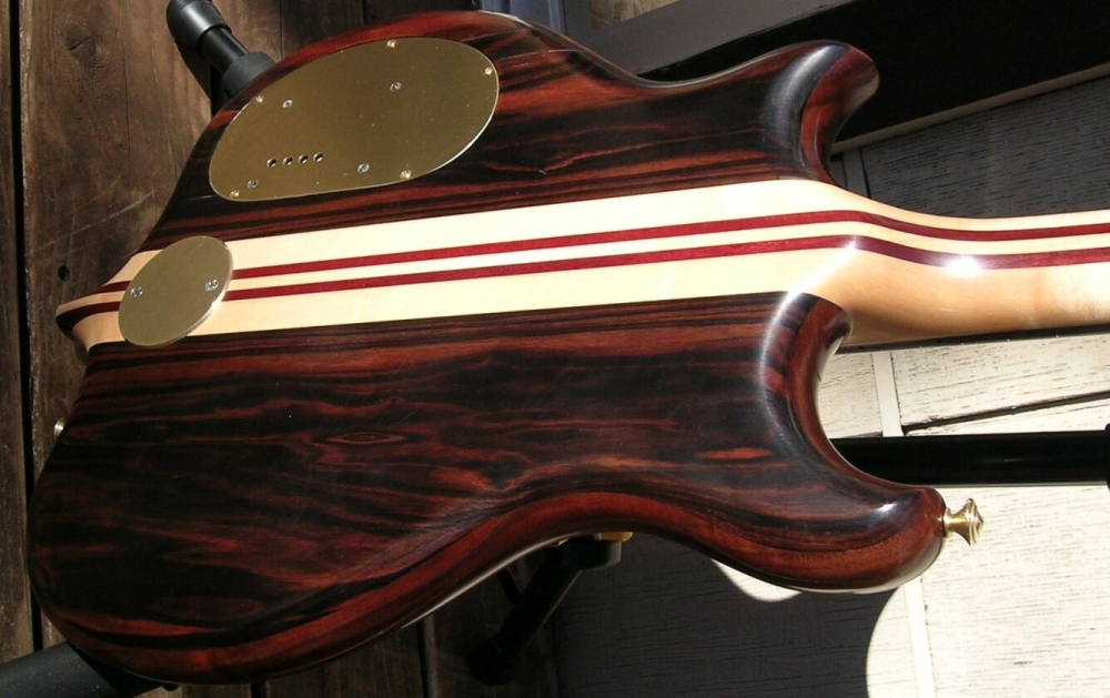 The woods in this bass are gorgeous.  From pitch blacks to deep reddish-browns.  I recognize the brass strap pins, so either they came from the factory, or I put them on 30 years ago.  Hardly need strap locks with these.