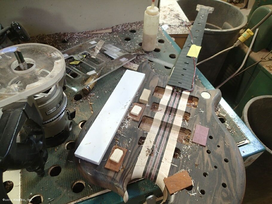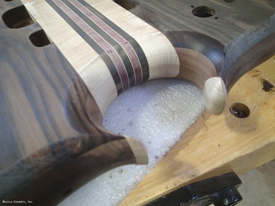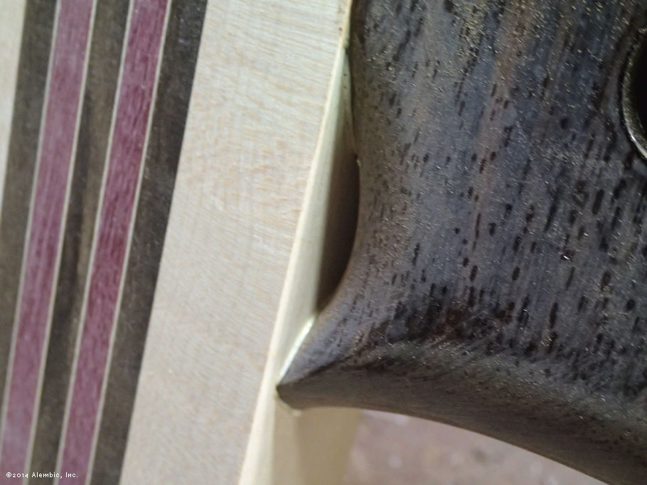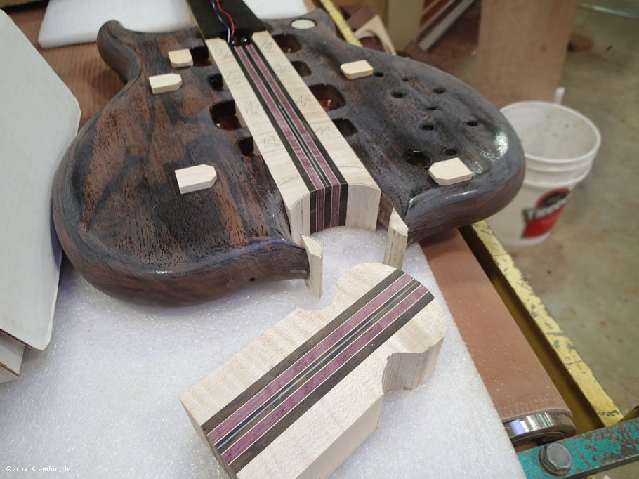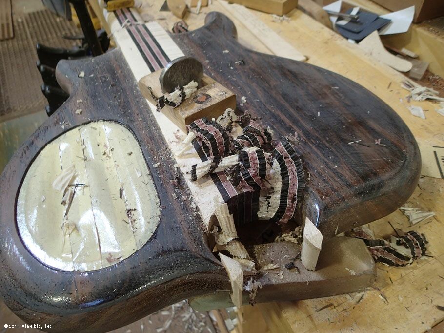 This is the bottom of the bass where Chris had previously cut the omega after filling in the battery compartment of the pointed bottom.