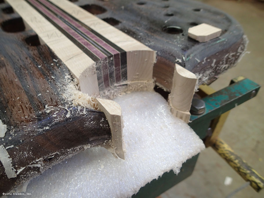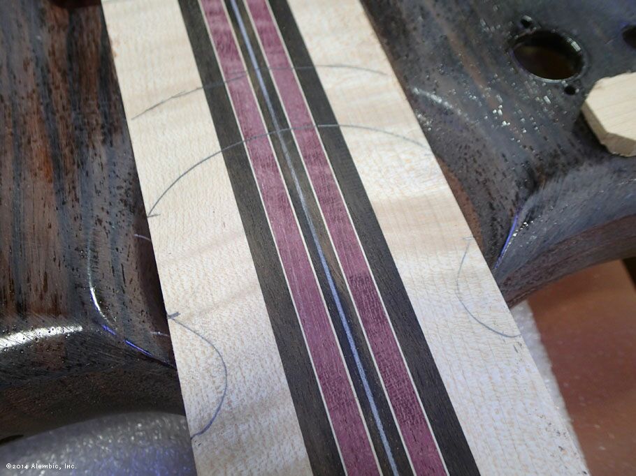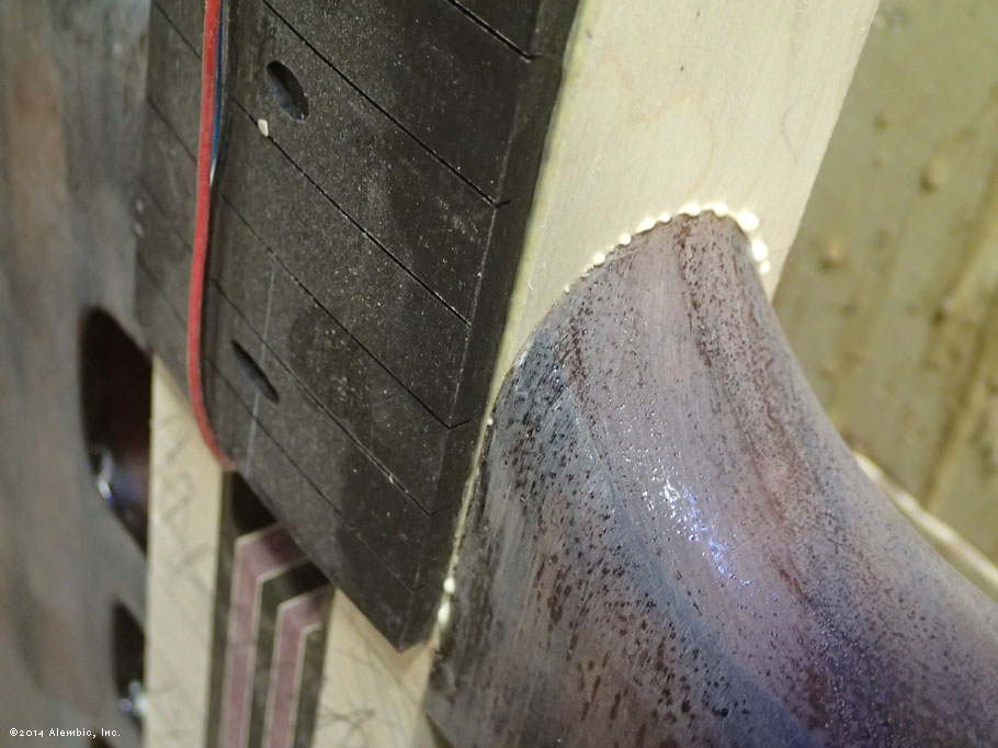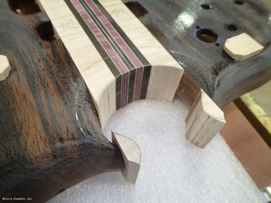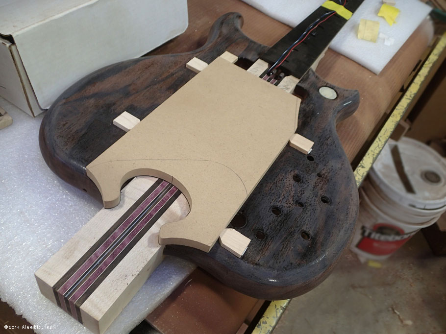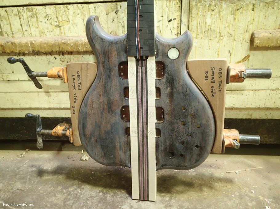 This is the bottom of the bass where Chris had previously cut the omega after filling in the battery compartment of the pointed bottom.
