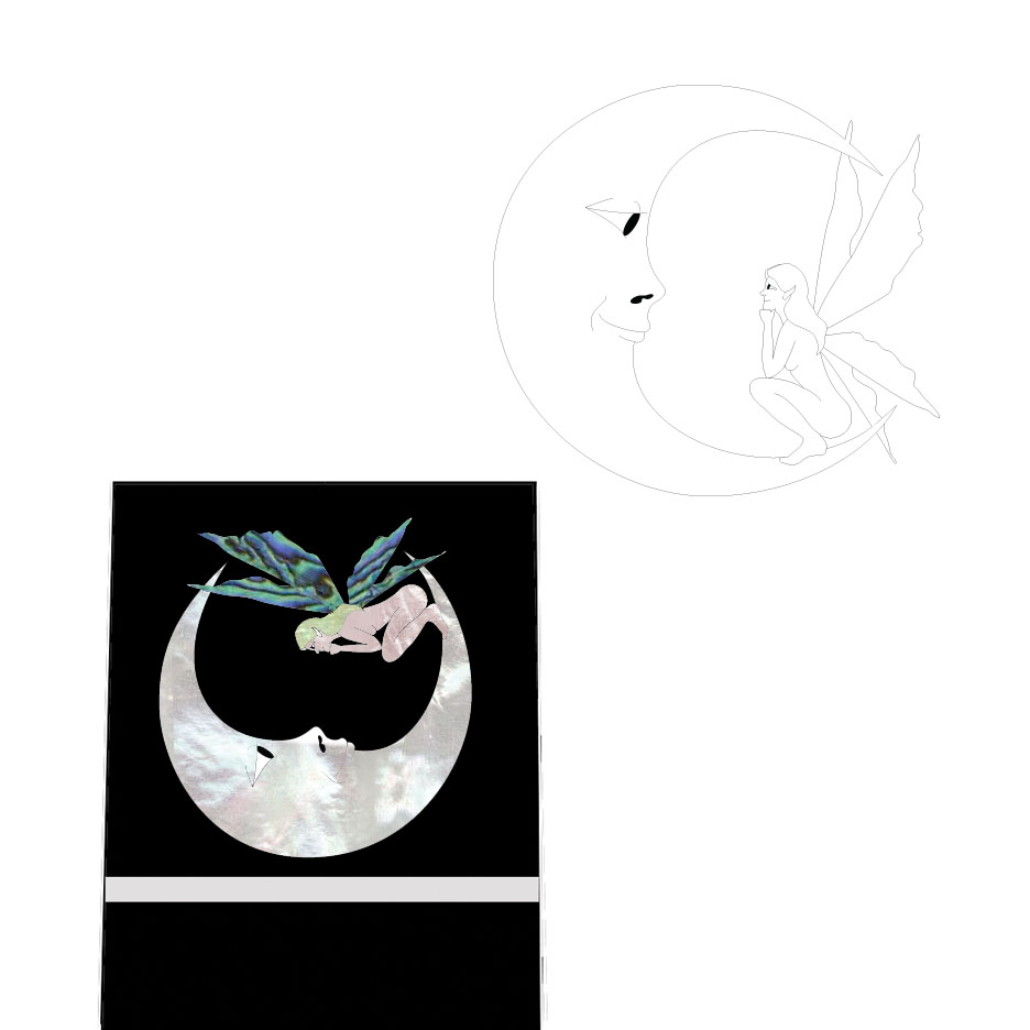 Fairy and Man-In-The-Moon inlay for first fret position designed by Mica and her mum.  I like it!I seriously though of Hello Kitty and Mr. Natural or Boy Howdy!, but thoughts of the next owner of this bass enticed me to go the fairy route . . .