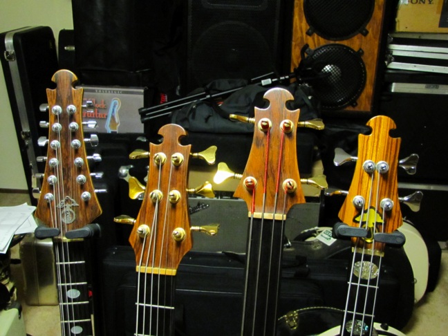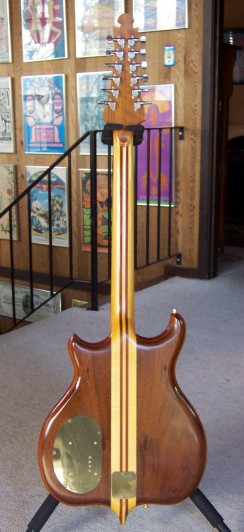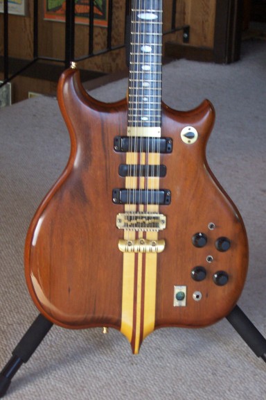 Here is my newly acquired '77 Series I 12 String.  I've always thought of the Alembic Omega as female and the point as male, so I'm calling this one "Big Irv" after my dad who recently passed away.  It plays amazingly - almost as easy as a 6 string!  Vital statistics:  LSG 12-string guitar  top and back: P. Walnut* core: Mahogany neck: Maple and Purpleheart, 25.5" long scale fingerboard: Ebony with mother of pearl ovals peghead veneers: Bocate and Walnut originally made for: Rothchild birthday: November 30, 1977  On December 5, 1977, Rothchild sent the guitar back to us to have LEDs installed.  On Augst 30, 1978, Rothchild sent the guitar in again to have the LEDs replaced. The 9th fret LED "goes out when the fingerboard is fretted at that postition. Please repair." We repaired under warranty.  *P. Walnut is probably for Peruvian Walnut, a true juglans Walnut from South America.