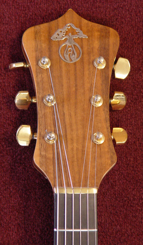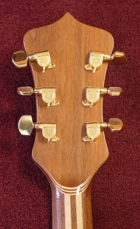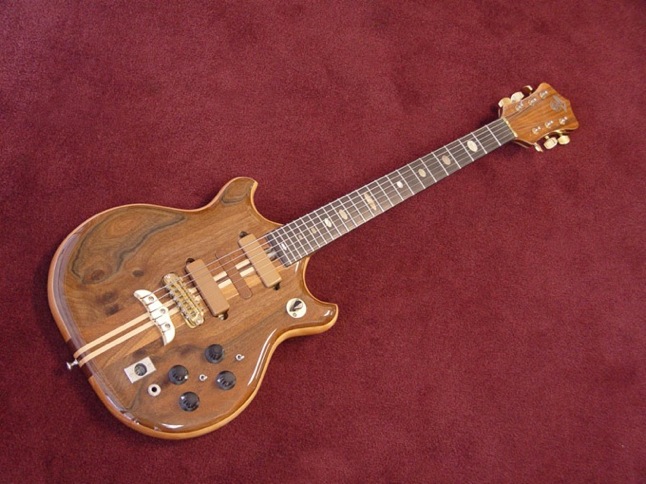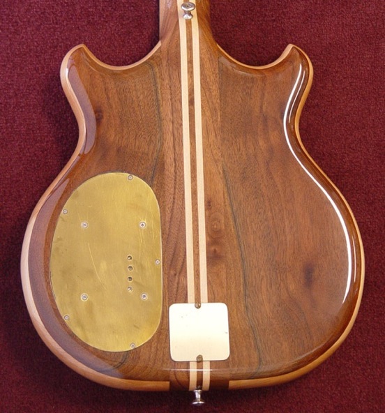 Jazzy; the wood recipe is walnut/myrtle/walnut on the wings, and walnut & maple for the neck.... The ebony fingerboard is set on a veneer of maple, which looks super-bad-ass w/ the refinish... Ron felt that replacing the original carmel pups was the main fix for 137's electronics qualms, and the new pup's color compliments the walnut and myrtle perfectly.