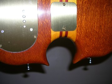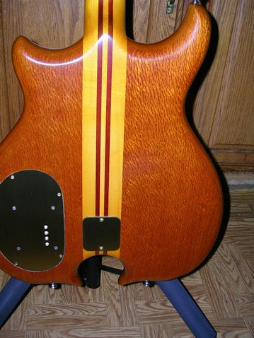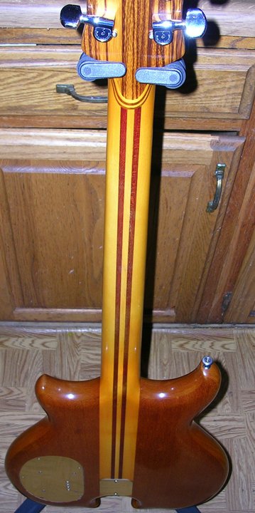 Purple heart front and back with cherry core and padauc frettboard. Check the pictures in the Alembic Series I Guitar #76-515 post in this same category.