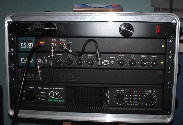 Rig consists of DS5R power supply, F2B preamp, ELF-M processor for BagEnd cabinet and QSC Powerlight 1.0 stereo amplifier