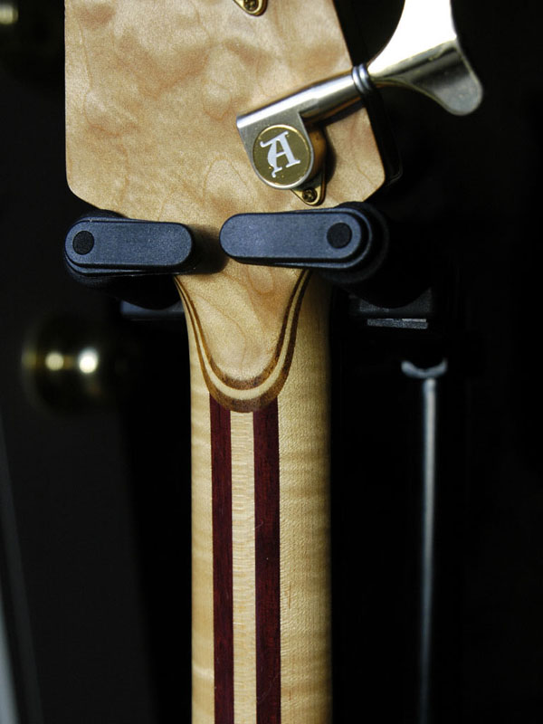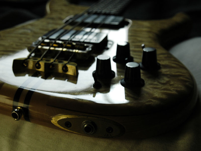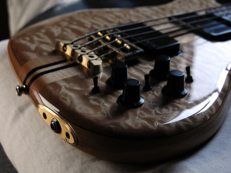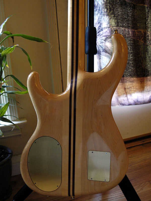 Very unique design of the beveled brass jack plate. Keeps the core wood intact and adds rigidity to 1/4 jack insertion point.