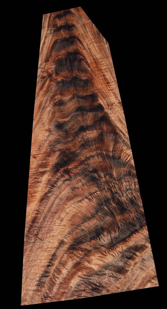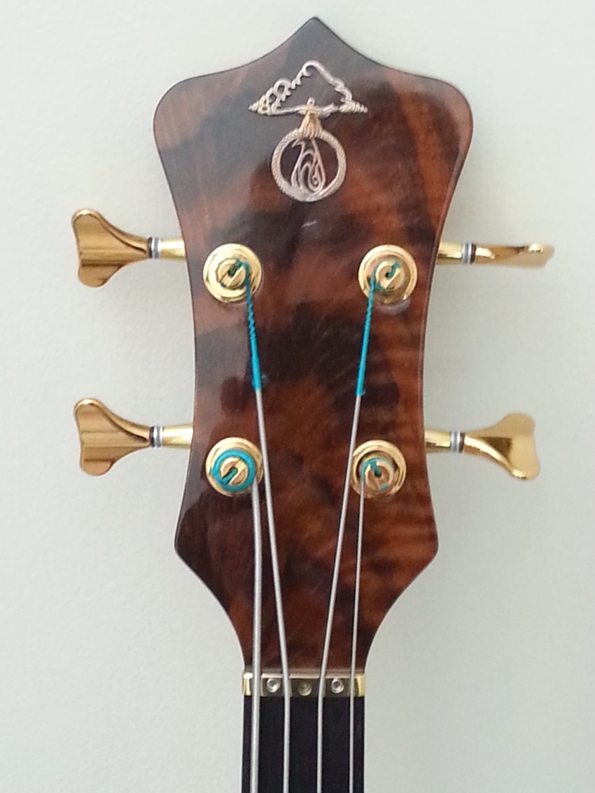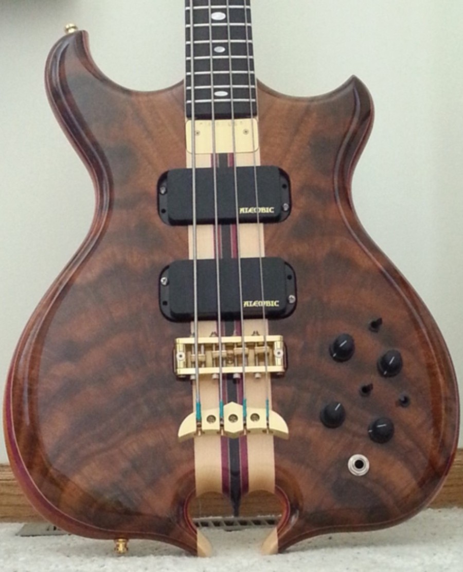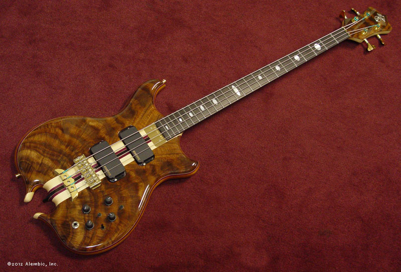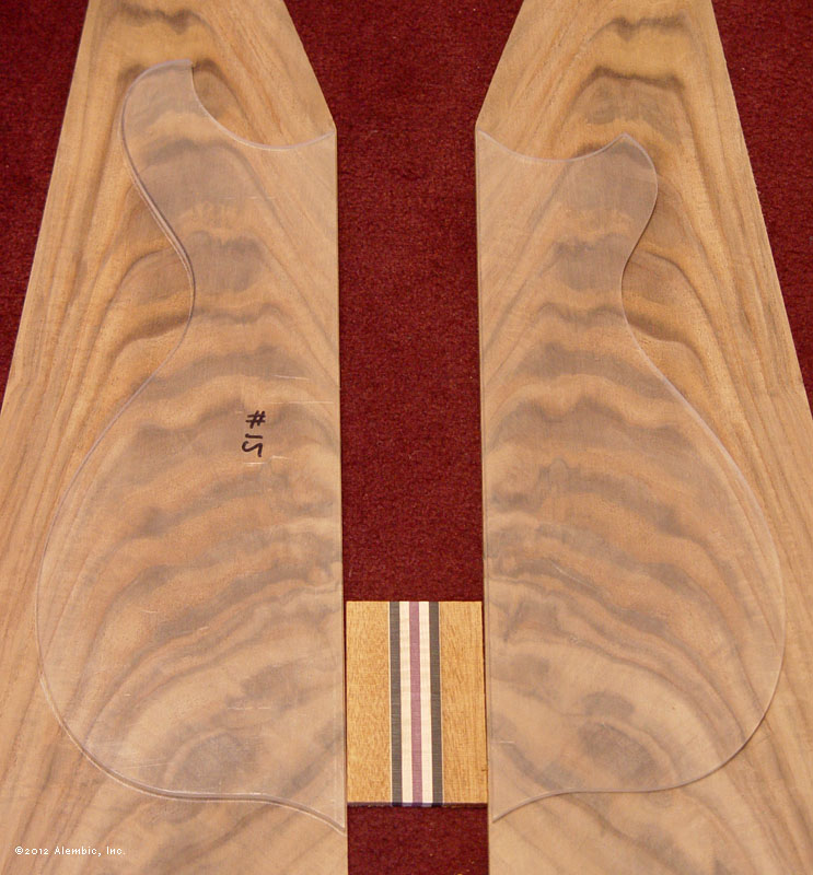 I'm surfing the web and see an Alembic bass hanging on the wall of a shop in Japan that has this gorgeous top of superb crotch walnut. Just for the heck of it I include it in a bunch of photos of walnut that I like and send it to Mica and Susan and my bass ends up from the same slab. You guys work magic!