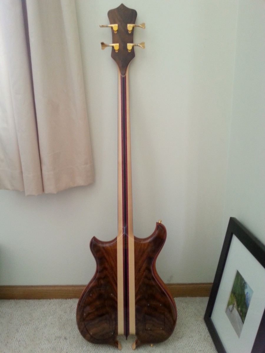 Here are photos of my recent custom build. A medium scale Signature Deluxe with a 3/4 body that's the perfect size for me. Crotch Walnut front and back w/ continuous backplates, Maple/PH/Ebony/PH/Maple neck, Red LEDs. WOW! Sorry for the poor quality photos.