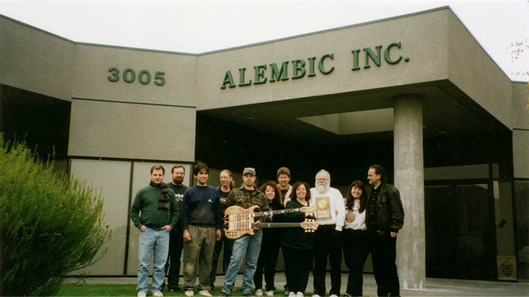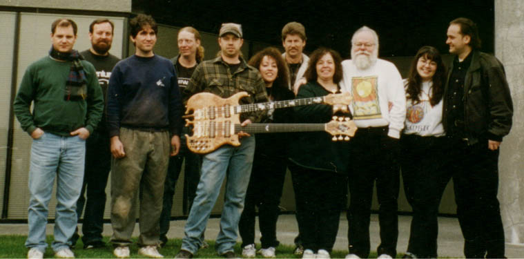 I dug out some old photos which were taken when the finished bass was presented to me at Alembic in 1998. Since it is common habit in my business field to give credits to those people involved in a project, I strongly felt like getting the "wizards" together for a group picture:  With no further ado (and with Mica's support) behold the "crew of wizardry" at Alembic in December 1998: