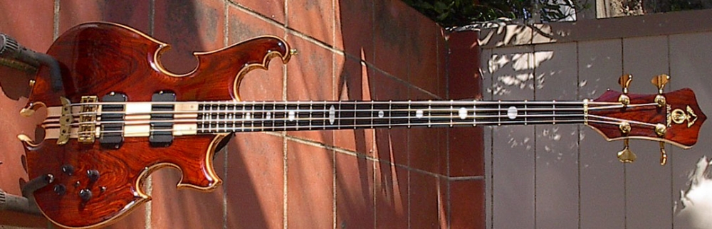 I had this one made last year, and it's a fantastic bass; neck  with Fender Jazz width, Cocobolo front & back, deluxe purpleheart laminates, continuous  backplates and truss rod cover. Since it is  a bit on the heavy side,  I used that excuse to convince myself to buy one more  ( that wasn't really too hard) so  I ordered   another one , hollow & smaller,  which is coming in a couple of weeks or  so. Same neck , same  top, ash body,maple & vermillion accent laminates, knobby peghead, Rogue Electronics, Fat boy pickups, Dual Omega Cutaway Body based on a modified essence body by Mica. I am obviously waiting for my new baby with great anticipation; this will be Alembic #4; I also own a 90s custom Signature Deluxe 4 fretless in coco bolo and a 1981 XY bass ,  a single pickup Distillate Bass which I believe was made for the Japanese Market in a limited  quantity of 300 all in Zebrawood  ; originally it was a medium scale bass, but I had Alembic rebuild it with a long scale neck a few years ago. I will post pictures of my other Alembics as soon as I take same.