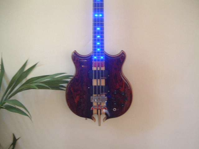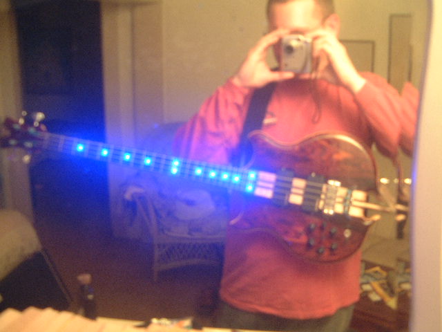 yeah, that shot's in a mirror. actually I am left-handed, but I play right-handed. it's a regular right-handed bass. oh yeah, I can turn down the LEDs. and that's not even at their brightest.
