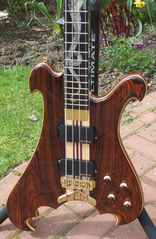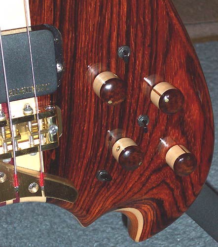 It was a Mark King Deluxe in a previous life  ;-)  I used the King Deluxe as my starting point because I liked the specification for the price. Series I was out of my league! As for specification, yes, I decided what I wanted on the bass. The shape is more of a story really - the body is a hybrid between something that I designed and something that Susan already had sitting in her archives. The rest is from Susan's imagination. The knobs are from Roger at THG Knobs and they are the result of ideas that we both had regarding knobs for the bass. In case you missed it, The Dragon's Wing was Featured Custom for January 2004... http://www.alembic.com/info/fc_dragonwing.html