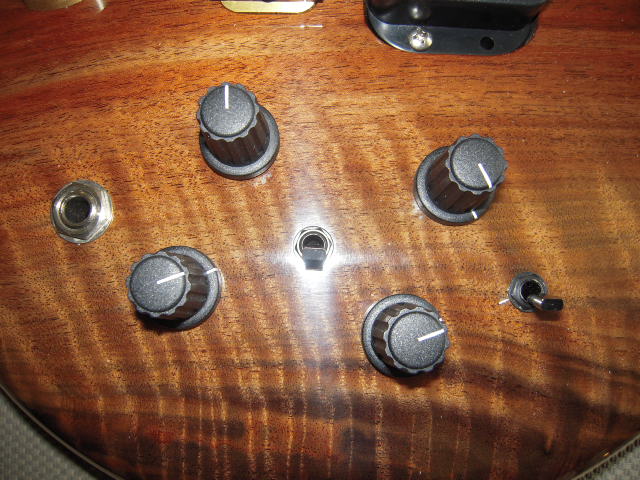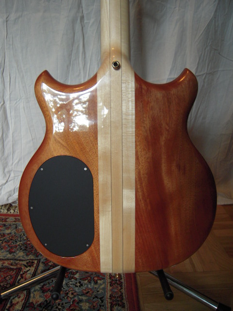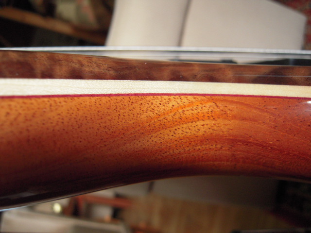This is just exquisite. First the flame walnut at the top and then a layer of maple and a purpleheart pinstripe and finally the mahogany at the back of the body. So beautiful.