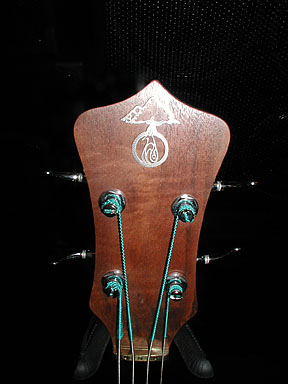 I thought I had asked for a bronze logo on mine, to better go with the brass bridge/tailpiece, but ended up with a logo like this one. I can see why silver might actually be a better choice: it blends better with the turquoise silks on the Alembic strings, and even the strings themselves, and it also seems to clash less with either black or chrome tuners.
