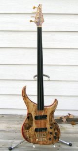 The fretless is Spalted Maple with an Ash body and a Purple Heart accent layer. The Spalted Maple actually has a flame pattern. It show's up in Mica's pictures and is more pronounced in person.