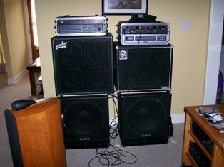 Furman Tuner,Alembic FX-1,DBX-160A,QSC PXL-1802,Carvin DCM-1000 Ampeg 4-8's(hi-range),Aguilar DB410(full range),2 Carvin BR-118N Subs