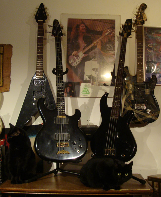 The Aria is an '84 SB Black 'n Gold I, the same type Cliff used in the end... I keep forgetting details on the other bass (the one on the left) I was hoping to get some info here (I think I saw some topics with a similar model on this board) The cats are: Rocky on the left (3) and his mom Spijker on the right (4) I would not go near those guitarz unless the cats know and trust you :-) Joking of course, these are the cutest and friendliest cats in the world, together with Cliff (Rocky's brother, grey striped so he did not make it through the casting of this picture) Kids: Don't try this at home, cats love climbing guitarz... This "situation" was created just for the picture ;-)