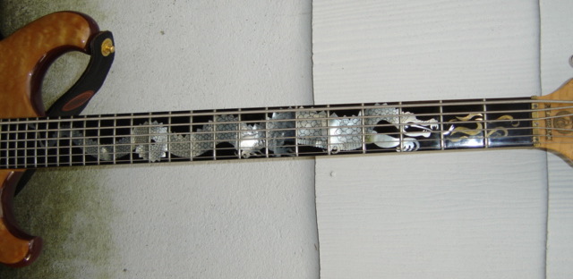 my first custom purpleheart body, quilt top, 6 str. mop dragon inlay. I broke it twice!