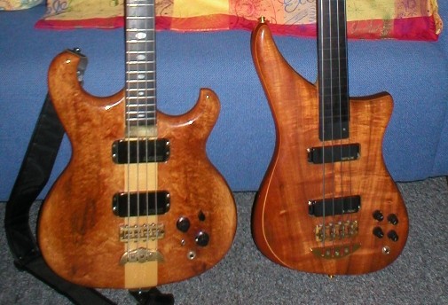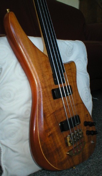Nearly 10 years after the first (http://club.alembicguitars.com/Images/411/4519.html?1055019057) here comes the second in my collection of koa-topped Alembics!  It's S/N 88S4828, 32", watermark koa top and (flame?) koa headstock veneers, oval inlays, Schaller tuners (chrome)  With koa you get very different aspects of the same piece of wood, depending on the light and the viewing angle. By day it's kind of brown with black speckled all over it, maybe like a piece of clothing painted in clair-obscur by Rembrandt. And there's a pair of lion's eyes pinned to the top corners of the neck pickup.