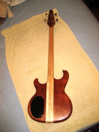 Well,I thought I would post an update, I have 3 coats of Tung oil on the bass so far.I "sand" the bass with 0000 steel wool after every application of rubbing in the oil.The plan is to get 10 coats on this bad boy by the time I'm done.Enough to give a nice natural shine,I'm really happy so far as the wood is turning out to be not as plain as I first thought.There is shimmer and figure in the grain when it plays against the light,and bits of flame here and there. The more I work on this bass the more I like it, its had a hard life and with hard work Ill have it looking and playing awesome again.And don't worry I'm not going to post every other time I oil it, I just wanted to show some progress since being stripped of the old finish! =)