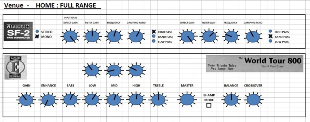James, I took your advice & unhooked the 31 band. I only used it on my Jazz Bass for drop D tuning songs so I could boost the signal to match my Alembic so I wouldn't have to reset my whole amp for the different basses. But I was getting a nasty hum with the 31 band patched in, not sure why, it never did that on my old amp. I am currently running my Eden World Tour 800B in Bi-Amp mode & have the SF-2 patched in the Post-EQ stereo effects loop. I go effects send to channel A in on the SF-2 in stereo mode, then channel A out to the high return on the WT-800 & Channel B out to the low return on the WT-800. I was experimenting today & I noticed that both filters on the SF-2 have a slight effect on both low & high outputs on the WT-800. The amp has a balance control so you can pan between the low & high speakers. I would have thought that the channels would be completely seperate in stereo mode on the SF-2. Is it because I'm only going into channel A with the send then out of A & B? This was one of the possible hookups in the manual. I wish the amp had stereo sends as well as returns then I could patch the SF-2 into the individual channels, but the amp only has one send & 2 returns in the post EQ loop. The Pre-EQ loop only has one send & one return.