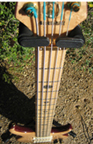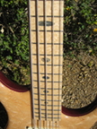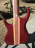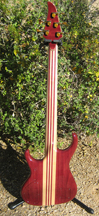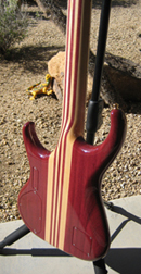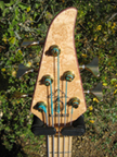 As promised, here are some better photos of this very regal 5-string. These were taken in my backyard located just north of Phoenix, AZ.  The top is bird's eye maple, bookmatched to center. The back is purple heart. Continuous wood truss rod cover (front) and electronics covers (back). Bird's eye maple fingerboard with oval abalone inlays. Gold plated hardware and cream pickup covers. Purple LED's with amber at 12th & 24th fret.  Enjoy!  FRONT: