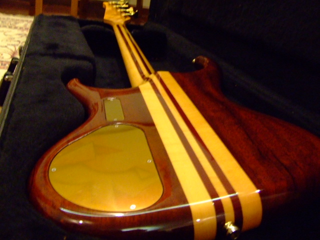 Congratulations on the newest family member! She looks like a sister to my Europa 6 string with 5A quilt maple top. However, it looks like your finish has some amber color in it, making it look deeper, or antique so to speak. The wood on the back looks like the standard Mahogany. It looks darker I think because of the amber tint. However, the grain pattern is mahogany, I am almost certain of it. You have a beautiful family. Do you think you will ever add a fretless brother, or a 5 string cousin?