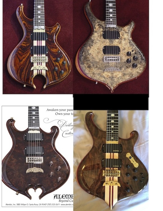 I apologize in advance for the lengthy post. I just received my fourth custom guitar from Alembic last week. The third arrived almost a year ago the same day. For the last two I didn't ask that a Factory to Customer thread be generated. In fact, for the latest one, I saw only a drawing and nothing else during its entire build?not even the woods that were to be used. I simply asked Susan to pick me out a nice piece of walnut. I had complete faith in their abilities.   So here's the story behind the latest one. The first three I had done to commemorate the birth of each of my three children. I told them that if they play guitar, they can have theirs once they are old enough. My youngest is almost seven, so there was quite a long time between the second and third builds. Not Alembic's fault. Life just always seemed to get in the way. It wasn't until my daughter began asking where her guitar was that I realized I had to do something.   Now, while having guitars built to honor your children and to "pre-humously" bequeath them might sound like a wonderful thing, for me it kind of backfired. Not only did I never take them out of the house for fear of damaging them, even when I played them at home they didn't seem like mine. It always felt as though I was borrowing them and so I never bonded with either of the three. I know?pathetic. But it didn't really matter, because I never played out of the house anyway. In fact the only time I jammed with anyone since high school was the three Alembic Gatherings that I attended over the last few years. But that all changed two years ago. Our local School of Rock organized a modified adult program and they got six of us to form our own group. So now I'm playing every week and four or five shows a year. For the first time, I needed an Alembic of my own. And so began the journey of what's affectionately come to be know as "The Beater" because it will be mine to play the hell out of!  Each time we built a guitar, we started with a completely new body shape?something that I've found very challenging. Let's face it, drawings can only convey so much. Even in progress pictures don't tell the entire story. Here's a montage of the four guitars. I stole three of Mica's photos because my photography skills are sorely lacking. The chronological order (oldest to newest) is top left, top right, bottom left, bottom right.