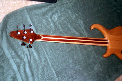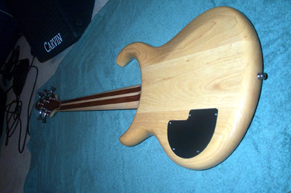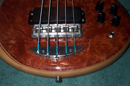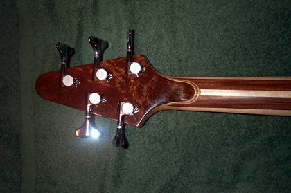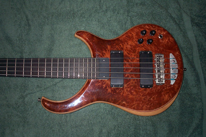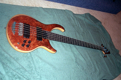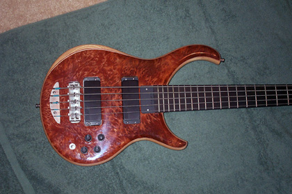 Okay, I've been promising pictures for almost a month now, and finally I've got them.  I'm not as good a photographer as Mica, but these will have to do.  I love this thing!  I vowed I would never play it out, well, that lasted about five hours.......  Specs: Alembic XLB-5 Excel Serial Number:  03X13109USA Top Laminate:  Redwood Burl Accent Wood: Maple, Purpleheart Body Wood:  Ash Neck Woods: 7 piece Maple, Pau Ferro, Purpleheart Fingerboard:  Ebony Veneers:  Maple, Walnut Electronics:  Vol, Pan, Bass, Treb, 2 FATBOYS Machine Heads:  Alembic Gotoh Custom Features:  Recessed Nickel Straplocks, Nickel Plated Hardware, Brushed Nickel Finish on Hardware.  I wish I would have had the trussrod cover made from the nickel too.  Mica, can I have you make that at a later date?  Pics: