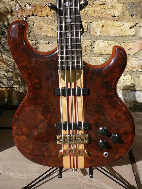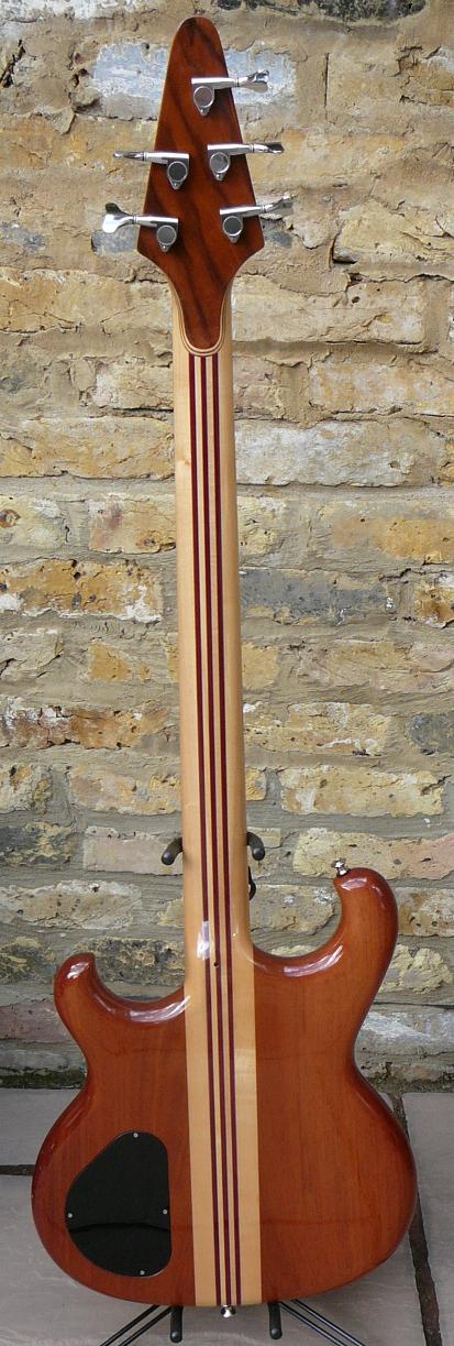 88P4783 top: Walnut body: Mahogany through body neck: Maple with Purpleheart, 32" medium scale fingerboard: Ebony with pearloid oval inlays birthday: February 12, 1988 originally made for: Manny's Music Pickups: 2x Alembic JZ Controls: Vol-Vol-Filter All original except for Dunlop Dual strap buttons and felts.