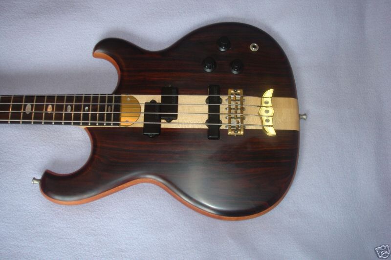 Nice bass John. The body is almost certainly mahogany. I'd say the top is a very dark piece of coco-bolo. You'll probably find there's an extemely thin walnut veneer between the fingerboard and the neck which used to be installed to aid fingerboard replacement. In case you hadn't seen it, there's a page on the main website dedicated to the company's history.