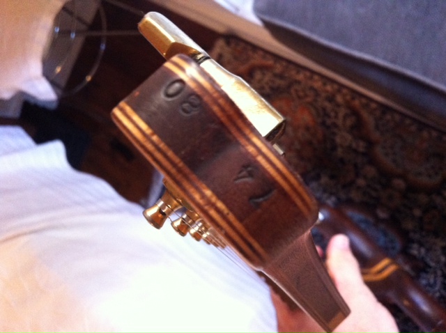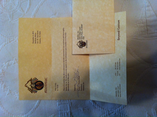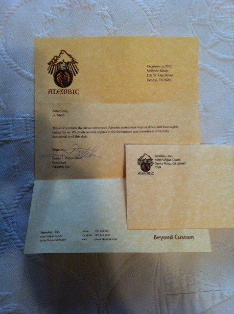 I have had this guitar for a couple of years, I bought it from someone in TX who had sent it to Alembic for a recondition, it came back with the letter below, from Susan W. She even notes the serial number on the letter. It works, and plays, amazingly. It has the original case, cord, preamp. Everything right and nice. What I like about it is the lack of decoration, not even fret markers! It looks the same as Carlos Alomar's rig but with a matte finish, and no markers. Anyway, add this one to the serial number list, I don't think there's any chance that Alembic used the serial number 74/80 for this guitar AND Stanley Clarke's Brown Bass.