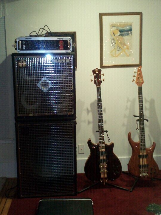 To the left is my Europa with a bubinga top that I've owned since 97, and the one in the left is my newest addition to my bass guitar family, a 32 scale Mark King with gold hardware, coco bolo top, abalone inlays, and a continuous wood backplate.