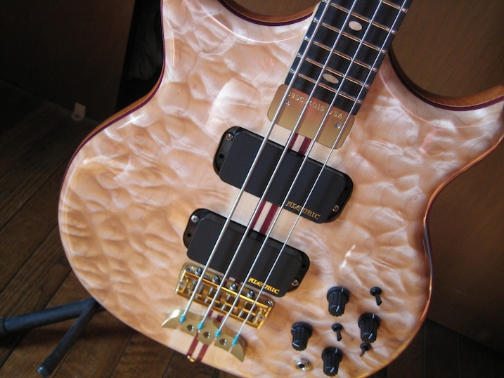 I had her named before it even arrived. Liquid Thunder. I always liked the look of maple, and the quilted maple on this beauty just dropped my jaw. Purpleheart is one of my all time favorite accent woods for a bass, so it was great to see it in the center stringers as well as layered in the body.