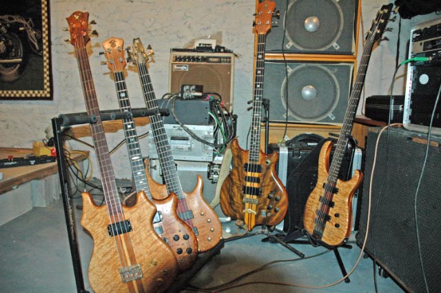 Here is a pic. Sorry to take so long getting back. L to R: Doug Irwin fretless, '81 Series I SB med scale, Early Modulus Q5 TBX, '79 Series I std pt long scale, very early Modulus Q6 TBX. Other Alembic products include the 3 1x15 cabs seen (topped by a 2x12) and an F1X preamp. The sub on the right is a Meyer USW-1 and works very well with the Alembic cabs.-hub