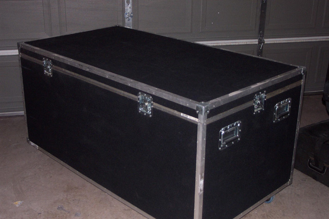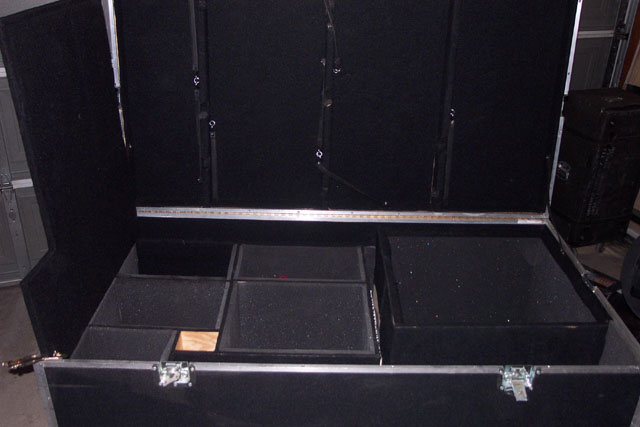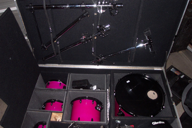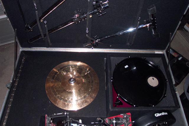 A few years back, we scheduled a four day recording session at my place near Charlotte.  Mark was living in Nashville then, and drove down for the session.  He backed his van up next to the door, set up a ramp, and wheeled out this wonderful road case.  The entire drum kit was stored in that one case.  It had individual compartments for the different pieces, with hinged sections and nice padding.