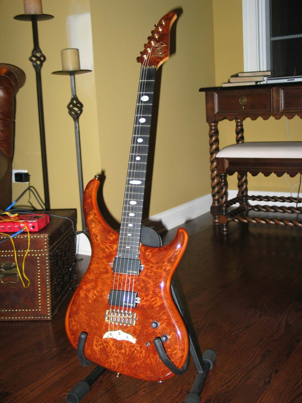 This is not my first post, but it's my pictorial debut. A little story about this beautful redwood burl Orion. I have been talking with Val about building a custom six string guitar. Suddenly, it occurs to me...I love the classic Alembic style, but I've never played one. Hell, I've never even heard one. I don't know anyone who has one and there are no dealers near me who have any. I've never heard what Alembic HG pickups sound like, or experienced the feel of one of their necks. One would hardly choose a wife or car based on looks alone (not likely). So why should a guitar be any different? While pondering this dilemma, this DEAD MINT (and I mean almost fresh from the factory condition) Orion came up for auction on ebay at a very reasonable price. I figured, at the very worst I'd have a guitar that I could either keep or re-sell and at best, it would help solidify my decision to have Alembic build me the guitar of my dreams. So that's it, in a nutshell. I love the Orion and Val and I are ironing out the details for my new baby. Keep your eyes open on the FTC pages.