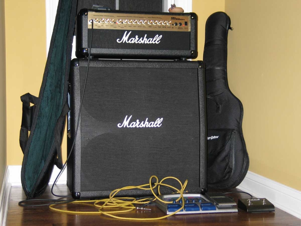 Sam - I currently play through a Marshall MG100HDFX head and slant cab. It's basically a more affordable setup for people who love the classic sound (and look) of a Marshall half-stack, but whose needs are much simpler. I'll post pictures tonight.
