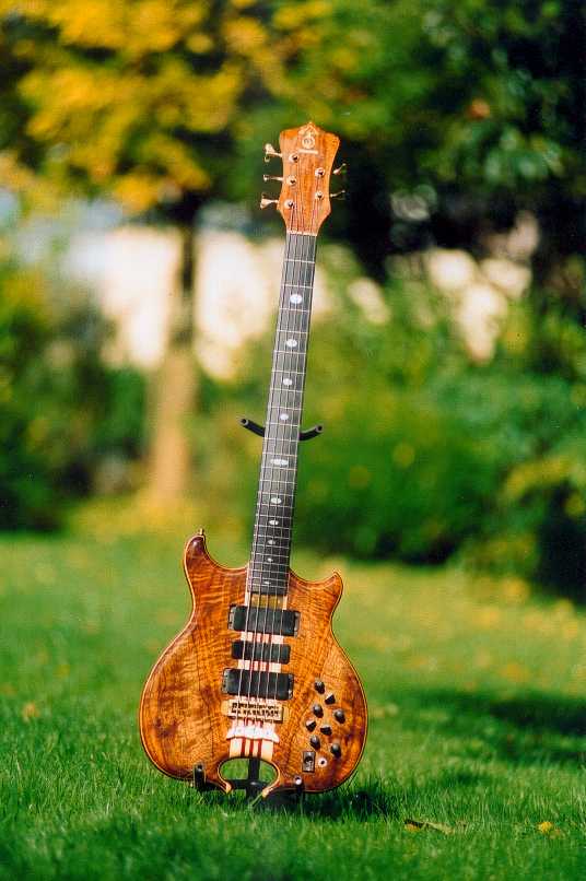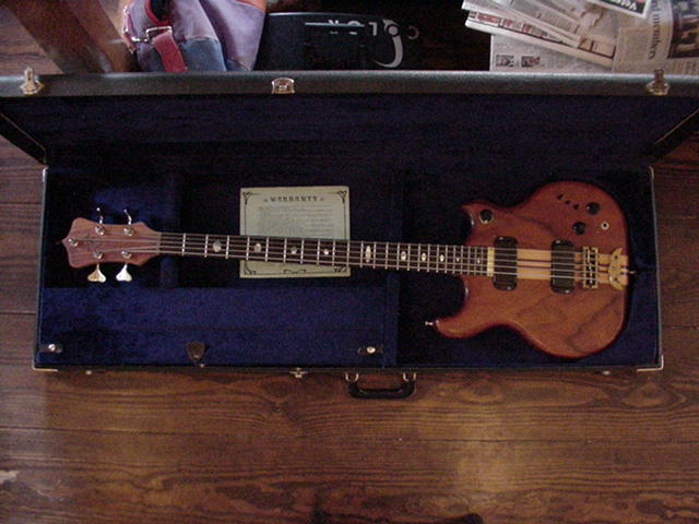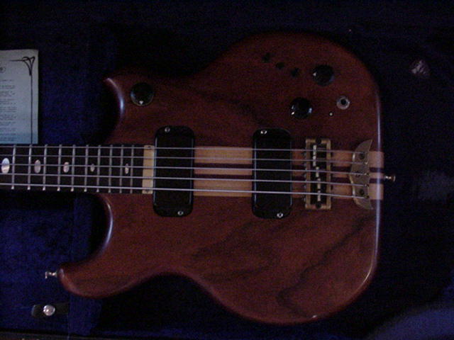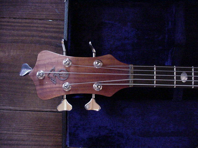 Here are some pix of the bass. Front view and close ups of the head and body. When I first had this done I was a finger player and it took me about three months to stop tripping over the strings! Suddenly I had strings where I had spaces and space where I had strings. I got used to it. I never was a slap funk player so the fact that you can't get between the strings so good wasn't an issue. I tend to be more melodic anyway. I switched to pick with my new band, I'm still not sure why and it plays and sounds much better. I think this is a great setup for a pick player. More of a guitar feel. When I decided to opt for the high C instead of the low B I started playing chords which work well with the clarity of this bass. No mud at all. Sounds really cool with a Chorus. I use only round wound strings with a very light gauge. This takes some of the strain off the narrow neck and it's much easier to play. This thing plays like silk. There's nothing like an Alembic.