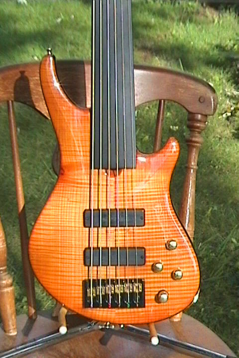 It always was (and still is) a dream for me to own a Roscoe (is it the SKB 6??). I asked Keith if he would make me a Complete Birdseye maple (peghead + fingerboard + body top) with mahogany body, gold/black hardware (but with black Collet-style knobs) and 3 band EQ from Aguilar with 2 volumes instead of the standard volume/pan. HE AGREED AND LOVED IT TOO!!!!
