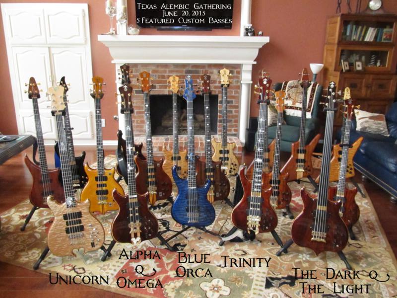 Here's all of the Alembic basses, sans owners. Custom basses upfront, I think you can recognize a few of them. From left: The Unicorn, the Alpha Omega, Ocra, John's custom Series, and Wayne's Started with frets until . . . fretless Series (aren't pistol grip horns so cool?). Custom or not, each bass has something different to offer a player. Veritable candy shop.