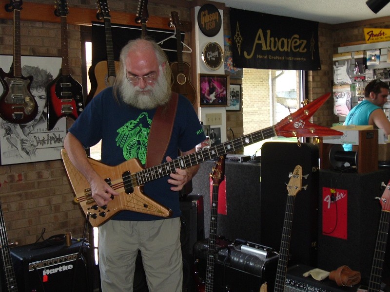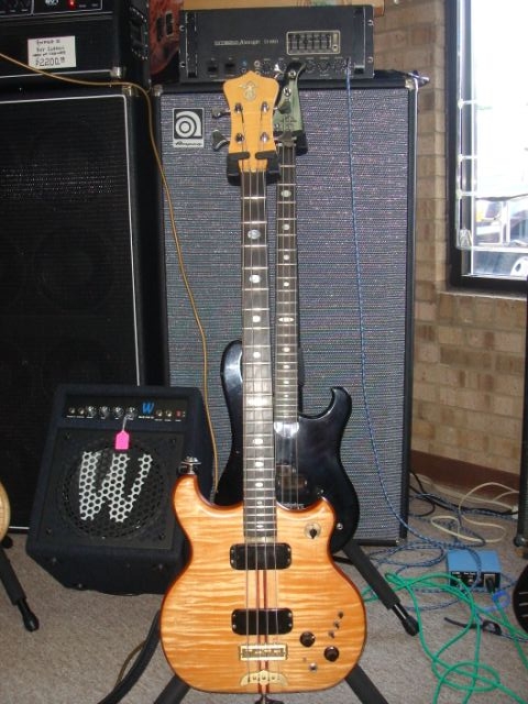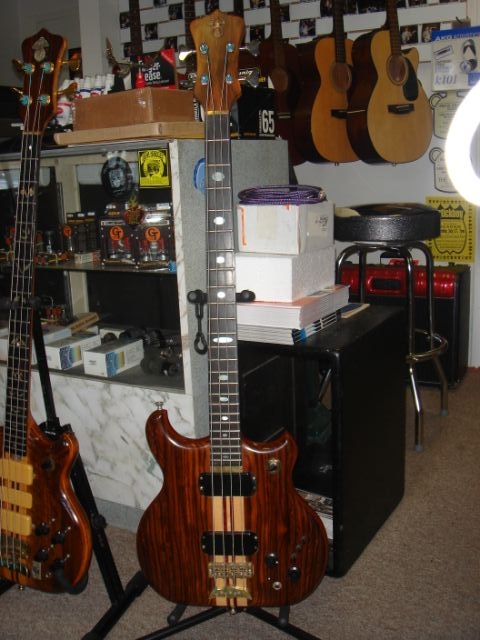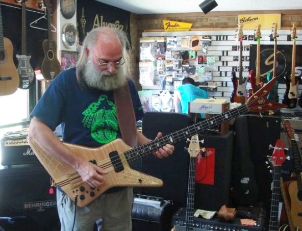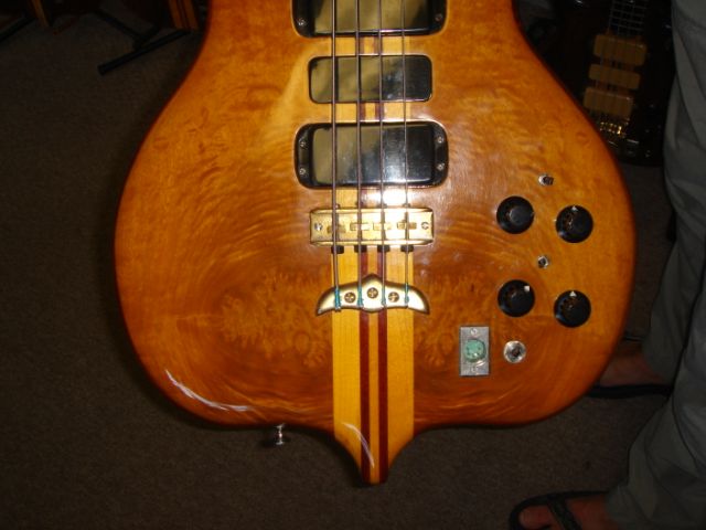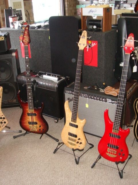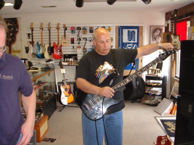 Also joining us was Ryan and his absolutely gorgeous Tribute.  And a couple other Alembic owners came by with more beautiful guitars and basses.  Another bass I enjoyed playing was Alan's SC; I think he was concerned I might take it home with me.  Alan brought a lot of beautiful basses.  For me, the most special bass there was Alan's red Essence, just for where it's been; it was nice just being there with that bass.  And I finally got to hold a Dragon's Wing; and I played a Spyder!  And there was a really nice Distillate, and a really nice Elan, and a really nice Europa; and I'm going to stop here; but no, before I stop I want to say that Kim was an excellent host, and a really nice person, and if your looking for an Alembic dealer in North Carolina, you might want to drop in and see him.  He seemed to be having as good a time as we were having just looking at all the instruments.  Did I mention the S1 guitars, and the ...