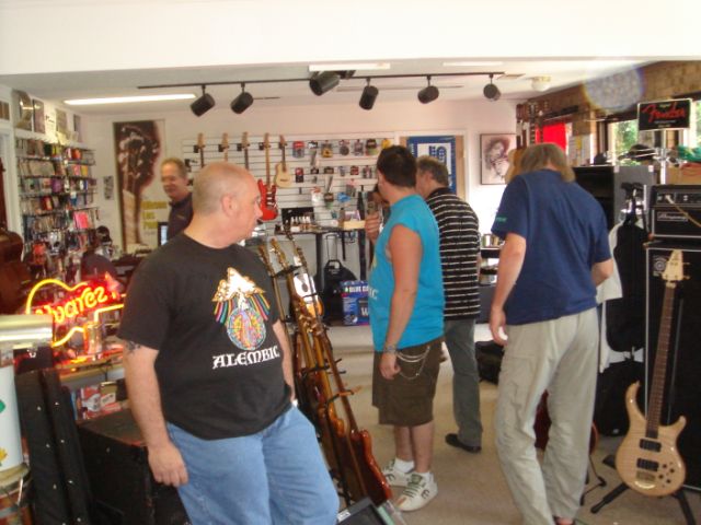 That's Mike on the far left, then Chuck, Alan, I can't remember this guy's name but he's a long time Alembic owner since I think '75 and brought several instruments, then Ryan, and then I can't remember this guy's name either and I don't have all the stories straight but his S1 guitar was bought new by his father.  Four pictures up, Kim, our host, is behind and to the left of Mike.  My apologies; if I don't write stuff down, I don't remember it.  Hopefully, someone can fill in the missing names.