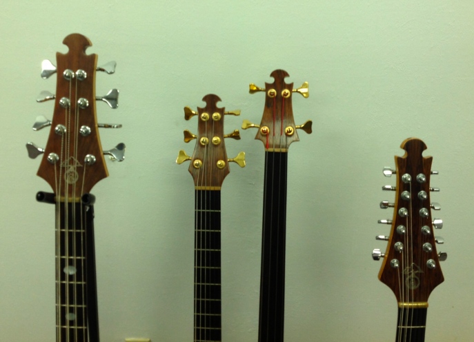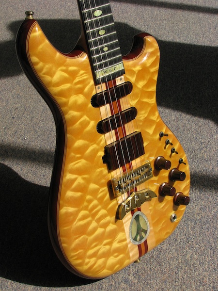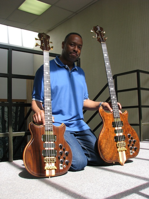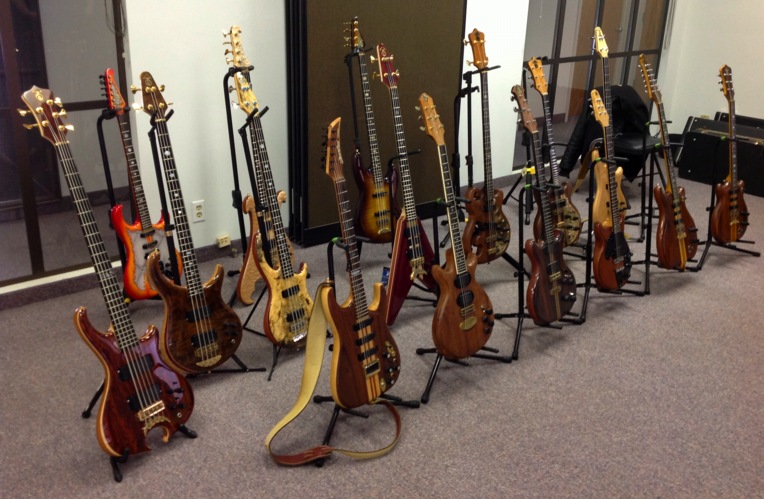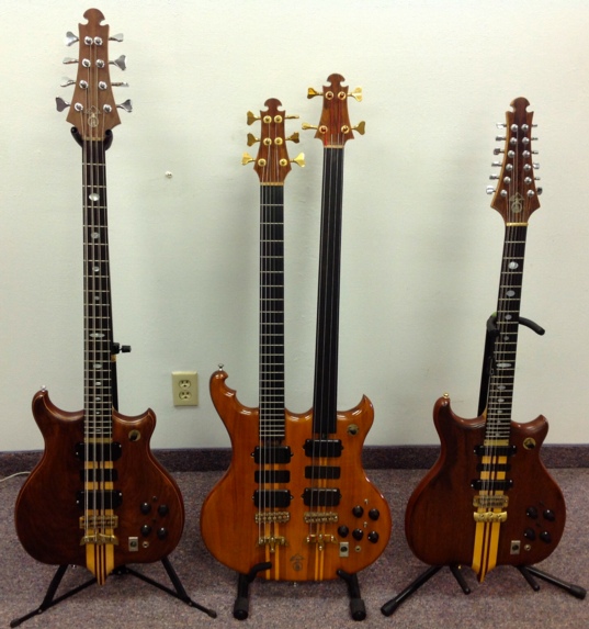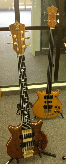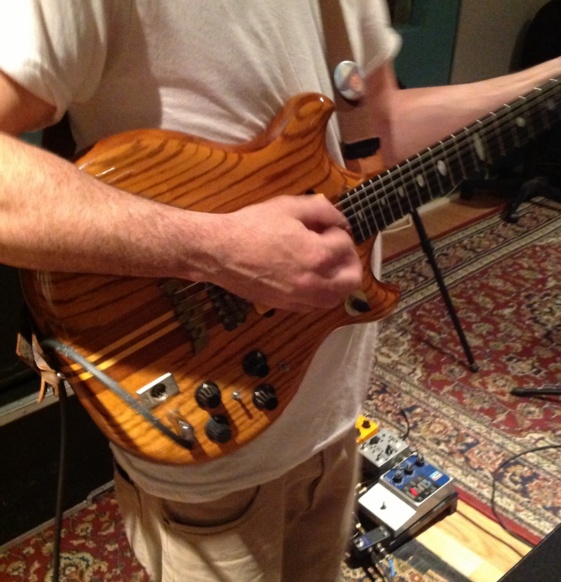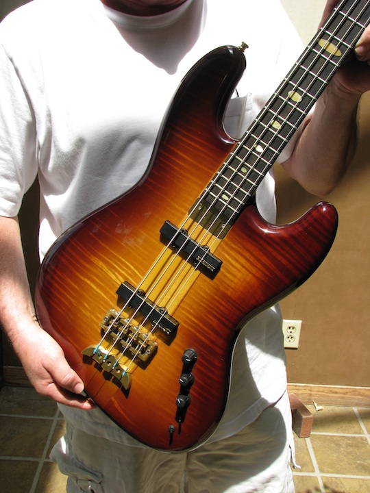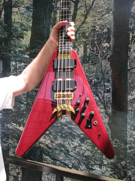 Lots of interest about the Flying V bass. The pictures do it no justice - the top is the most beautiful piece of purpleheart I've ever seen, with grain running parallel to the wings. It's short scale and really intense sounding. There was a lot of thought about the size and placement of everything. Quite amazing!
