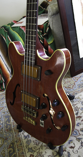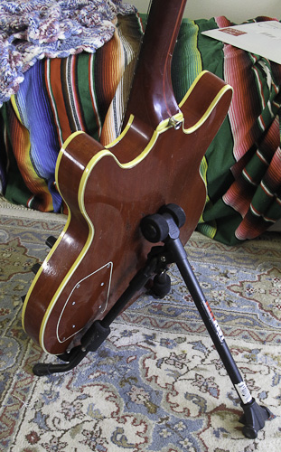 OK, here are some shots of my Starfire in my favorite stand. It also works quite well with my Series I. It is a Fretrest by Proline, model FS100E.  Asymmetrical body types might have more difficulty. The basses tilt back at a pretty good angle, so it sits solidly and the center of balance is very low. I've never had a bass fall off it. Series basses with points are problematic, as the point will hit the floor.