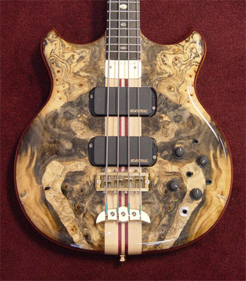 OK, I can see both of those - but my first thought was femurs & an under-developed pelvis. Then, between the bridge & tailpiece (inside the Rott's mouth, so to speak), the neck covers the middle of a human mouth. And of course, in the upper bouts, kneeling on the dark wood facing the fretboard, are (left) a guy in a striped suit and (right) a woman in a matching long dress. All in all, an amazing piece of wood!