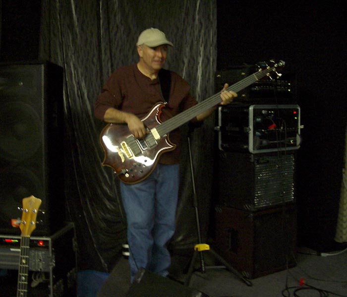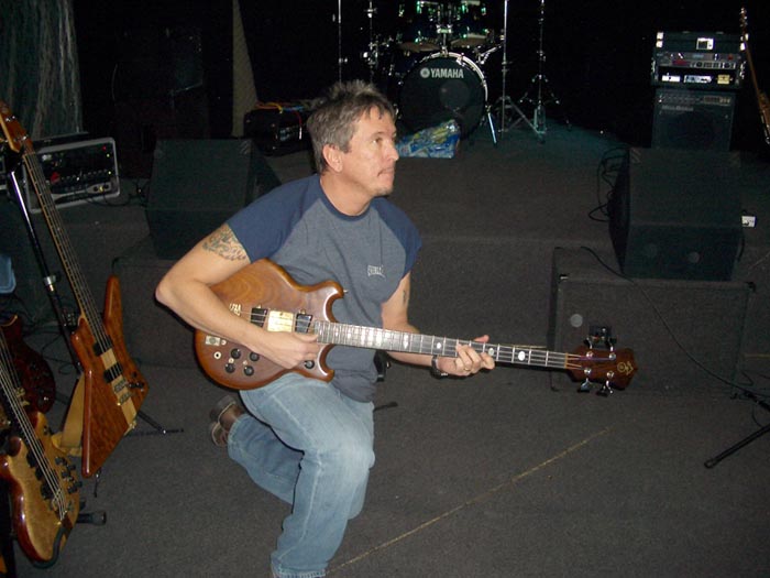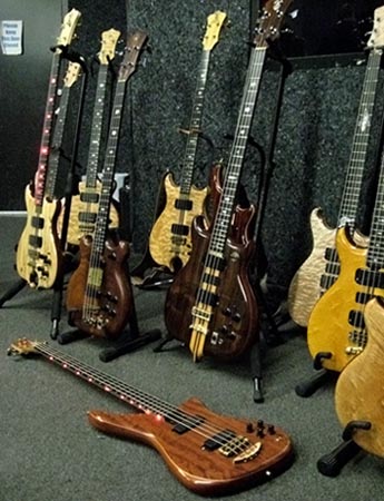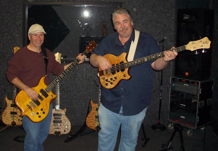 Olie holding Michael's Alembic #16. Aside from the historical aspect, #16 is absolutely gorgeous. To the left are Michael's graphite Alembic, John's Exploiter and Wayne's fretless fiver.