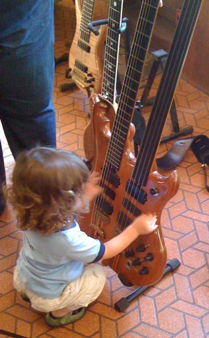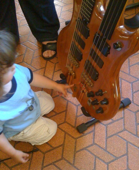 I wasn't even sure if I was going to be able to attend - something came up for the morning, this has been a busy month, but I knew I had to go! I didn't take my amp this year, but did manage to somehow drag the doubleneck out. I had my Stanley Clarke 5-string updated to Anniversary electronics about a month ago and Mica was nice enough to deliver it to the gathering for me.   I'm really glad I went - one of the highlights was seeing Erik with the doubleneck - he had been strumming the necks of some of the instruments, but when he got to the doubleneck, he used both hands simultaneously!